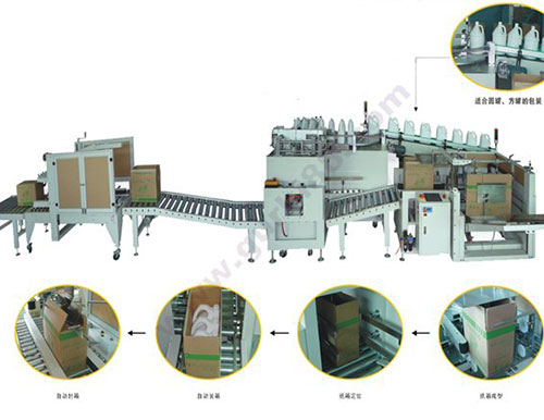 1.該自動(dòng)包裝流水線是集紙箱成型、自動(dòng)裝箱、自動(dòng)封箱為一體